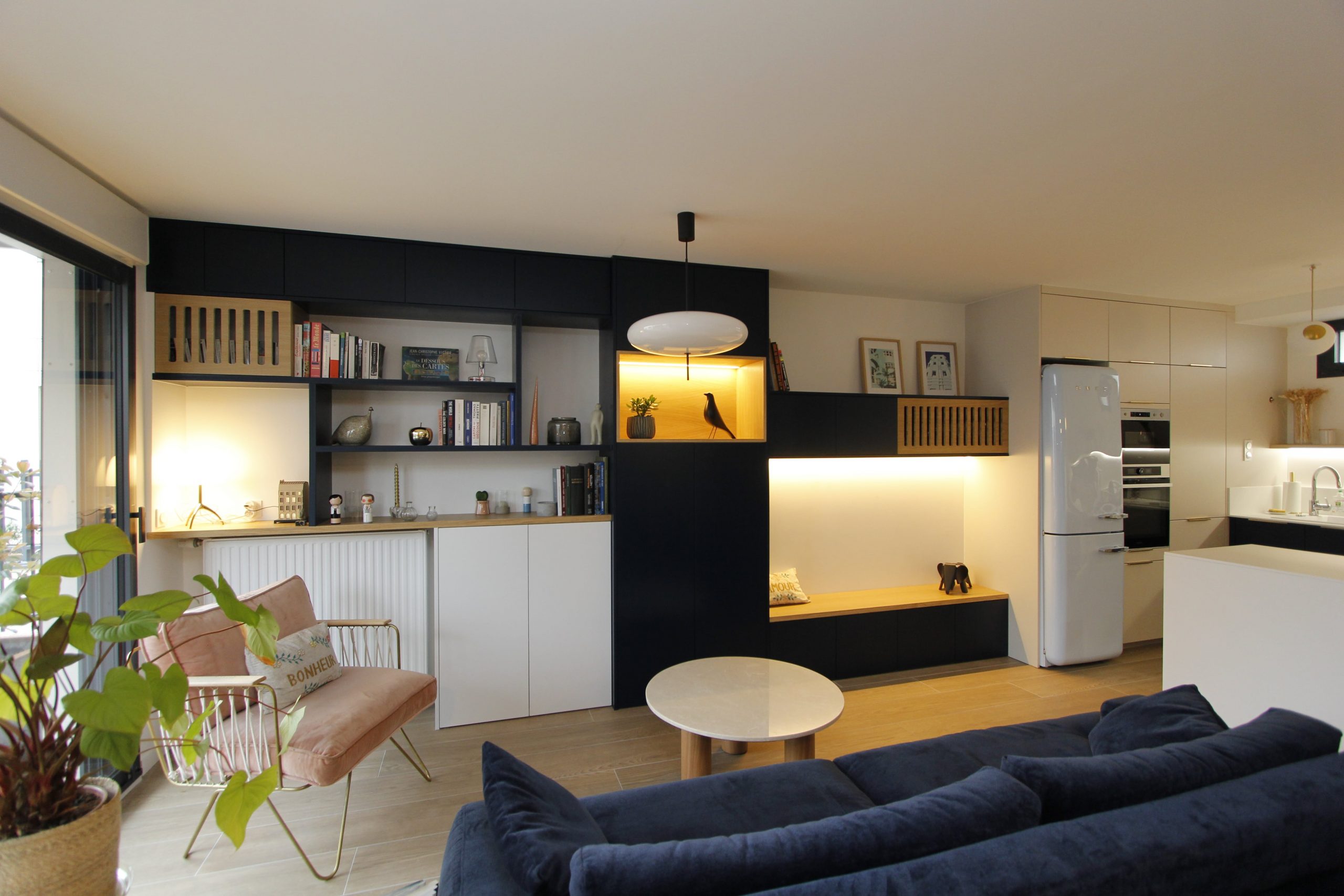 Dans cette pièce ouverte, la pièce de vie est délimité grâce à ce grand meuble sur meuble. Plusieurs zones et fonctions ponctuent l’espace sur 5 mètres. La bibliothèque en partie haute : elle accueille livres et éléments décoratifs, des rangements bas traités en blanc avec de se fondre avec le radiateur attenant, une colonne centrale bleue avec une niche décorative en chêne et la banquette permet de compléter les assises du séjour et renferme des rangements en dessous.